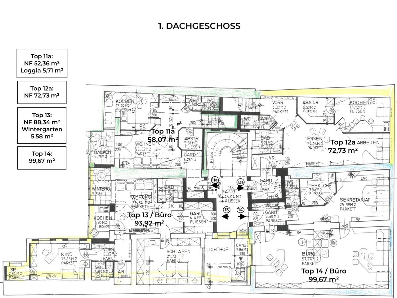 Büro TOP 13: GNF 93,92 m² - aktuelle monatliche Nettomiete € 1.152,54 - wird ab 31.12.2025 frei und kann somit selbst genutzt werden !