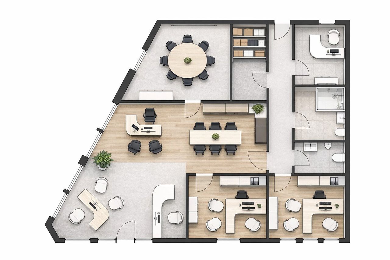 Ideal für mehrere Arbeitsplätze, Einzelbüros oder flexible Arbeitsplatzmodelle. Die großzügige Fläche ermöglicht eine klare Zonierung und fördert Austausch sowie effizientes Arbeiten.