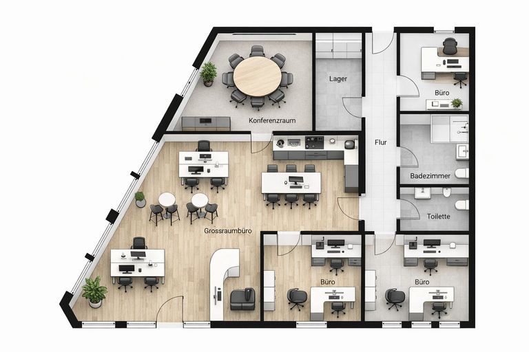 Attraktiv für Architekten, Designer, Start-Ups oder Projektbüros mit flexiblen Arbeitszonen.