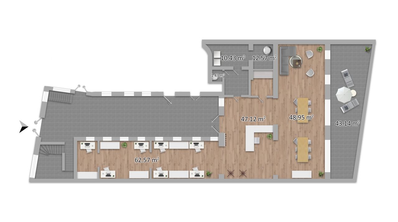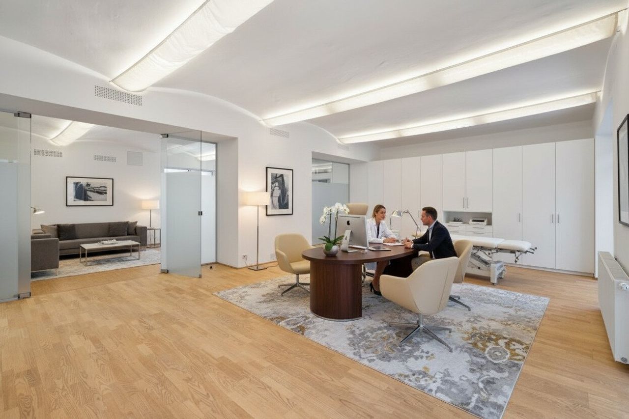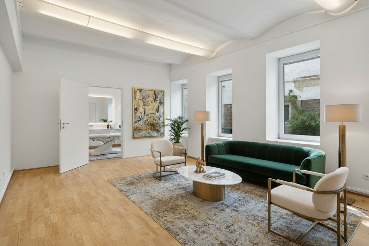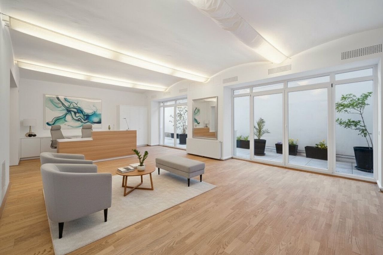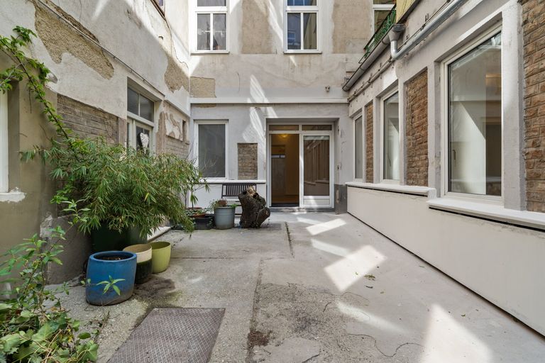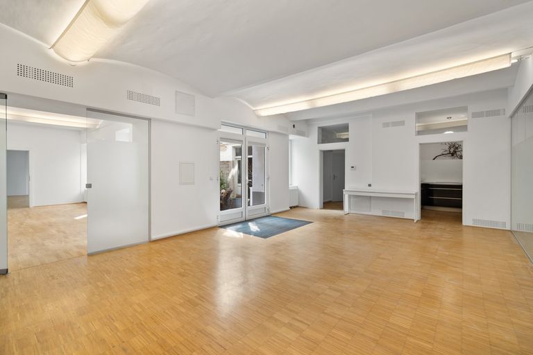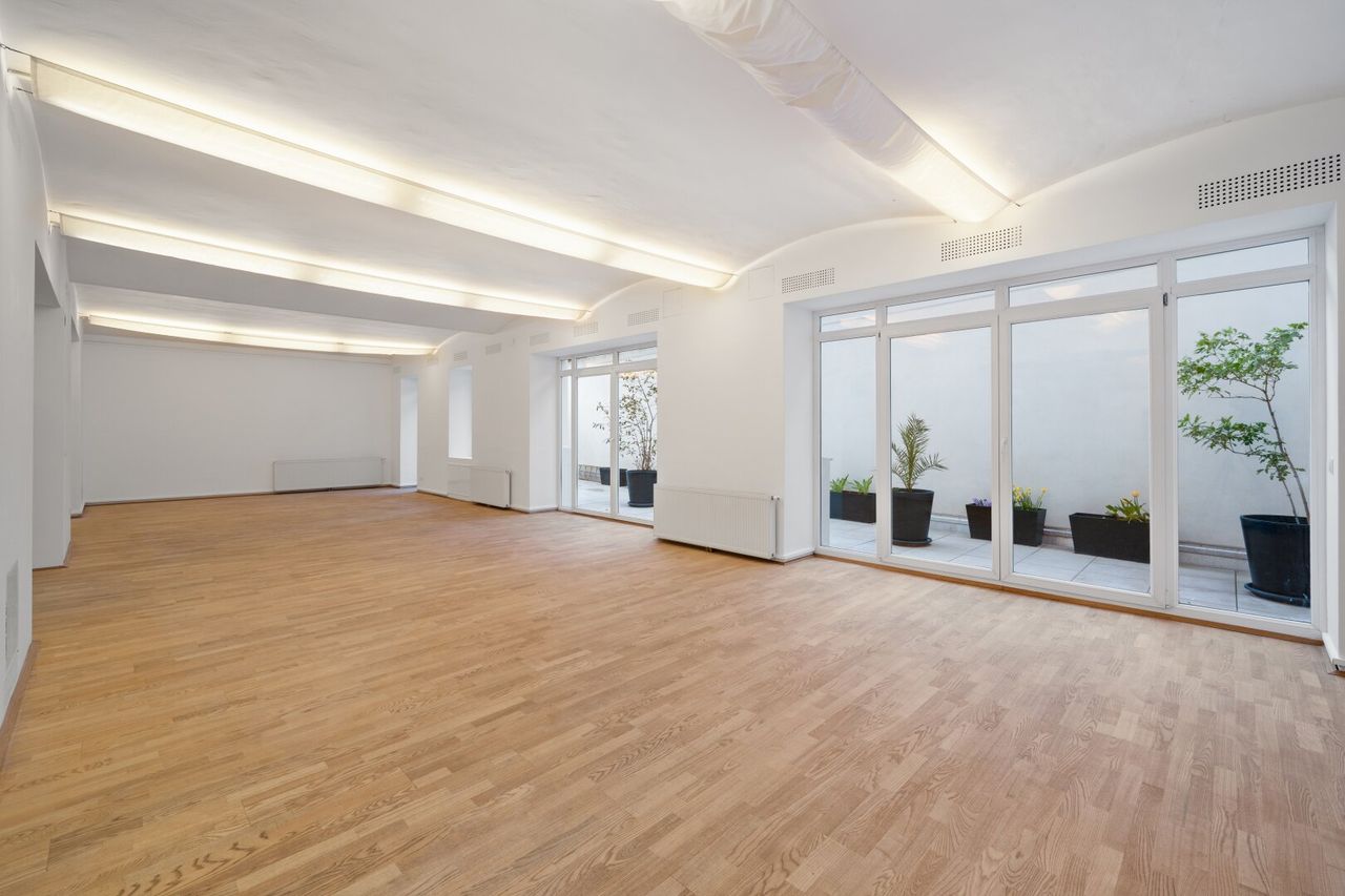 Über einen stilvollen Gang gelangt man in einen ruhigen, lichtdurchfluteten Innenhof, in dem sich die zum Verkauf stehende Immobilie befindet. Die Einheit verfügt über ca. 260 m² Nutzfläche und wird derzeit als Gewerbeflächegenutzt, wobei ein Teil der Fläche als Büro gewidmet ist. Ergänzt wird das Raumangebot durch eine eigene Außenfläche von ca. 43 m², ein seltenes und besonders wertvolles Detail in innerstädtischer Lage.