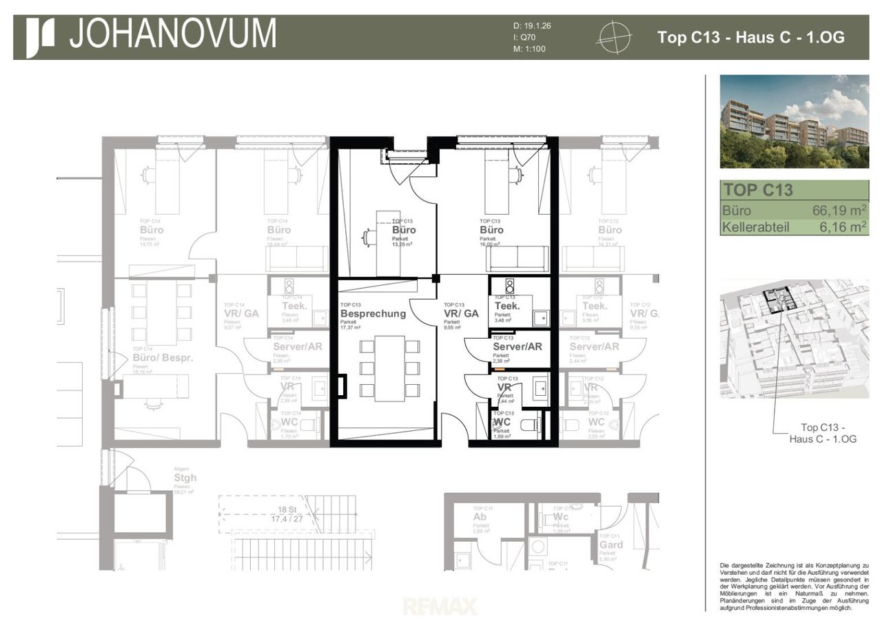 JohaNovum – Büro C13 | ca. 66,19 m² Diese gut strukturierte Büroeinheit bietet rund 66,19 m² flexibel nutzbare Arbeitsfläche. Zwei separate Büroräume sowie ein großzügiger Besprechungsraum ermöglichen eine klare Organisation von Team- und Einzelarbeitsplätzen. Eine eigene Teeküche, ein Server-/Abstellraum sowie ein separates WC sorgen für effiziente Abläufe im Arbeitsalltag. Die durchdachte Raumaufteilung macht diese Einheit besonders attraktiv für moderne Dienstleistungsunternehmen, Kanzleien oder Praxisnutzungen. Garagenstellplätze sind zum Preis von € 33.500 pro Stellplatz verfügbar und nicht im angegebenen Kaufpreis der Wohnung enthalten. Sie suchen etwas ganz Bestimmtes? Auf Anfrage übermitteln wir Ihnen gerne weitere verfügbare Einheiten im JohaNovum. Das „johaNovum“ in...