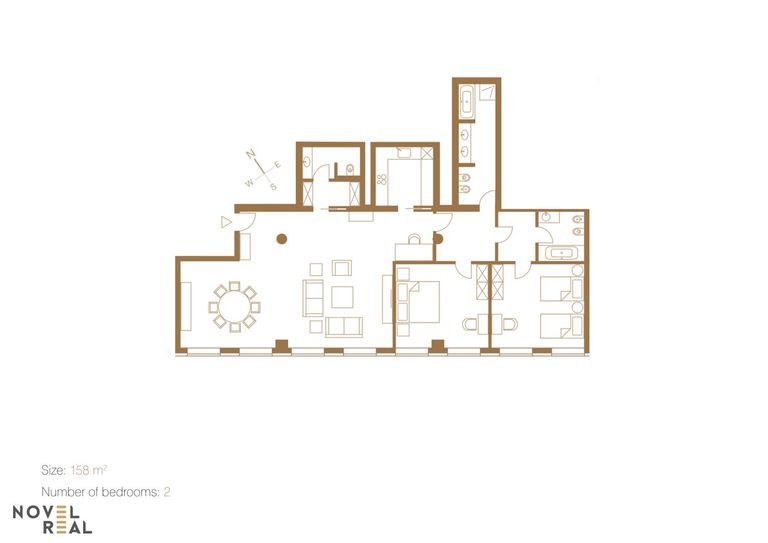 Zwei luxuriös ausgestattete Badezimmer, eine separat gehaltene Küche sowie zwei einladende Schlafzimmer vervollständigen den repräsentativen Wohnbereich und unterstreichen den exklusiven Charakter dieser besonderen Einheit.