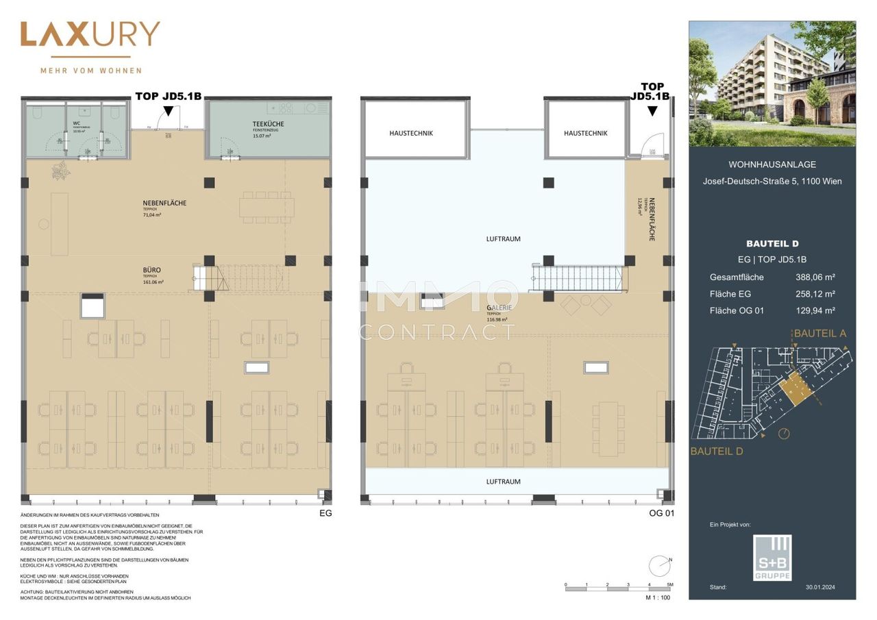 LAXURY - More from Living! In an urban location, less than five minutes from the main train station, a modern residential building with 80 privately financed condominiums ranging from 29 m² to 180 m² of living space is being constructed. All apartments feature open spaces such as private gardens, balconies, and terraces, creating an attractive added value. Great emphasis is placed on individuality in the fittings: you can choose between three different design lines as well as four parquet flooring options. The building also features state-of-the-art technology: heating and cooling are provided via component activation (floor slabs), and with the...