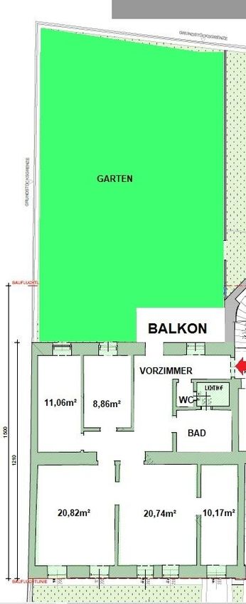 zentrales und großzügiges Vorzimmer, 4-5 Zimmer möglich, 3-4 Schlafzimmer, geräumiges Bad mit Wanne und Dusche, extra WC, südseitiger Balkon mit Grünblick, Eigengarten mit ca. 139m², Kellerabteil