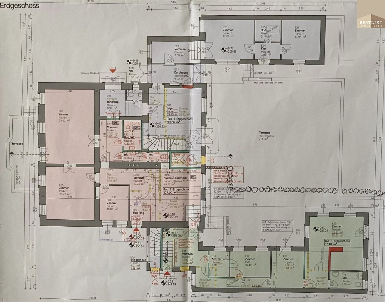 Die im Plan rot- und grün markierten Flächen sowie ein weiterer Terrassenteil im hinteren Bereich stehen Ihnen exklusiv zur Verfügung; Details erläutern wir Ihnen gerne im Rahmen einer Besichtigung.