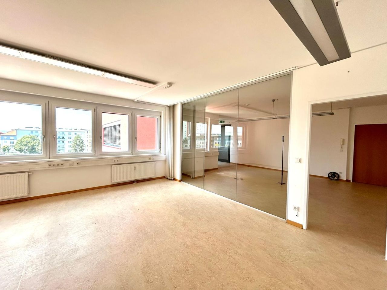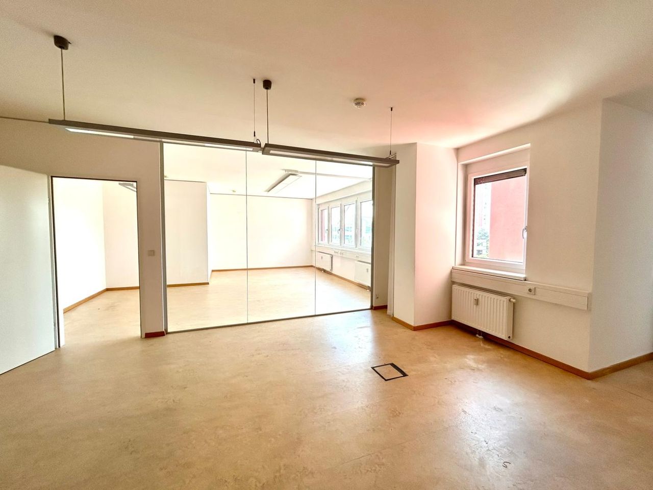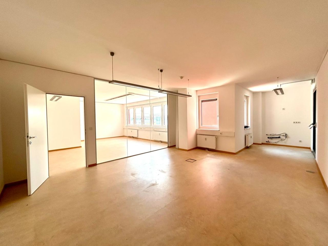 Diese helle Bürofläche gliedert sich in zwei ähnlich große Räume, die durch eine Glaswand getrennt sind. In einer Nische ist Platz für eine kleine Teeküche - Anschlüsse sind vorhanden.