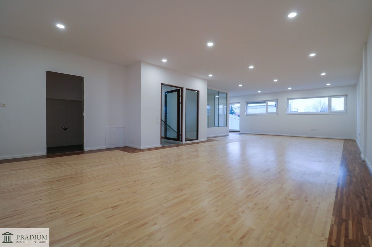 Diese außergewöhnliche Einheit kombiniert klassische Büroflächen mit einem beeindruckenden Saalraum: