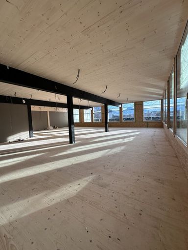 Großzügige Fensterflächen, offene Raumstrukturen und eine hochwertige Holzbauweise sorgen für helle, repräsentative Büroräume mit besonderer Atmosphäre.