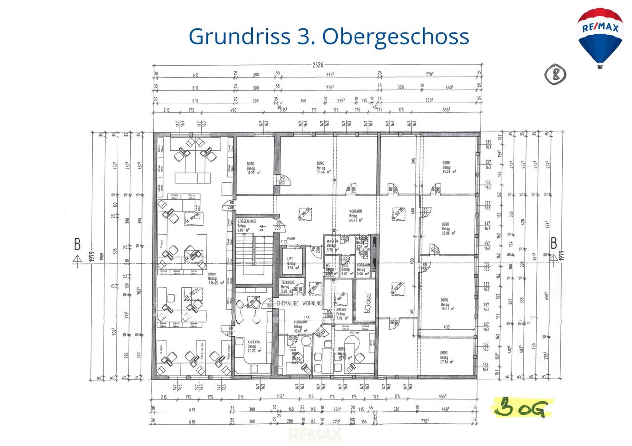 Drittes OG: ca. 420 m² Büroflächen verteilt auf ca. zehn Räume, ebenfalls mit Küche, WCs, Bad und Archiv. Bürogrößen von 20 – 116 m². Auch eine Wohneinheit ist hier möglich.