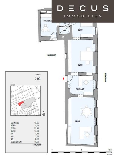 Insgesamt ca. 106,76 m² verteilen sich auf Empfangsbereich, drei helle Büro-Räume, einen Sozialraum mit Teeküche, WC mit Waschbecken, Vorraum und einen Abstellraum, der flexibel auch als Serverraum genutzt werden kann. Beheizt wird über Fernwärme mit Radiatoren.