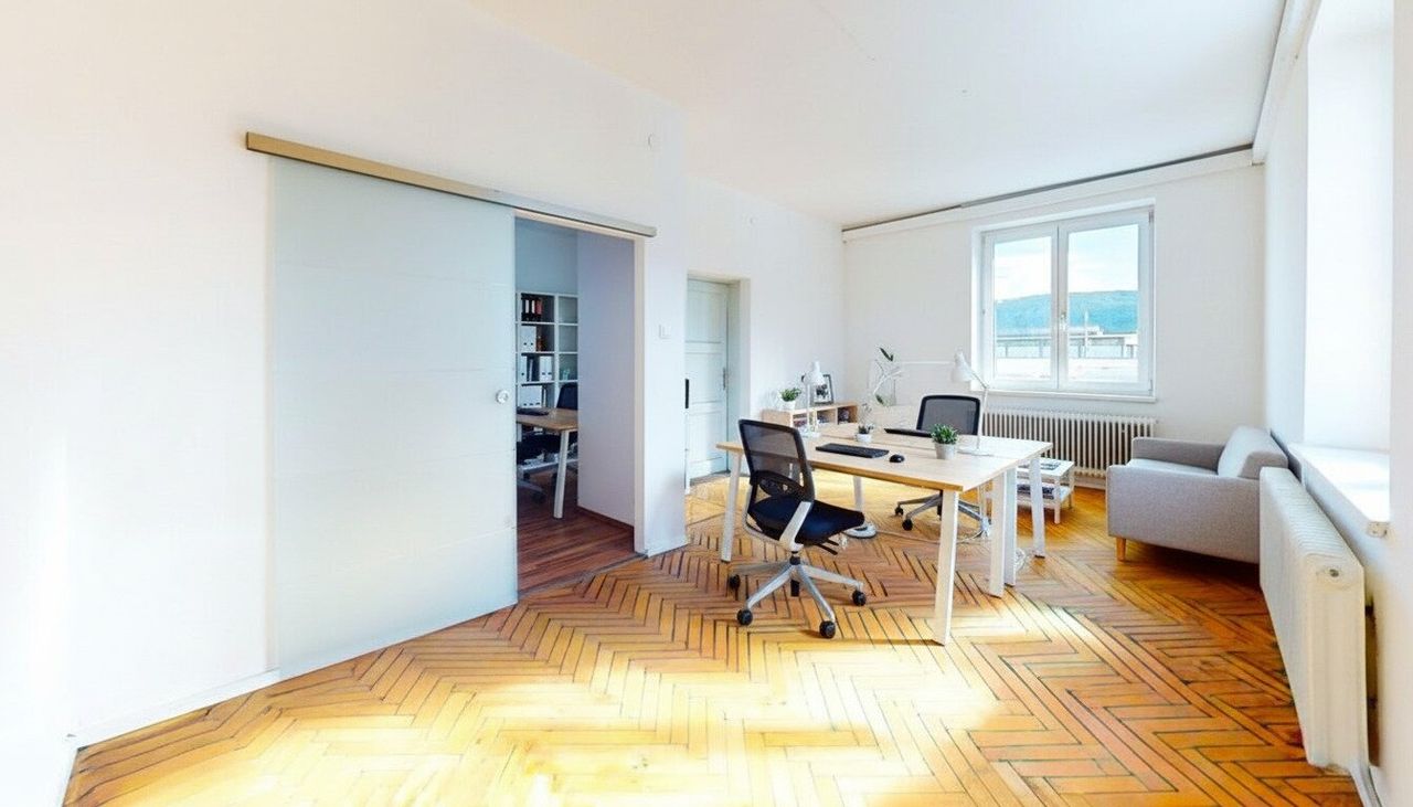 Drei helle Büroräume, davon ein Raum mit Küchenanschlüssen, ideal als Sozialraum oder Pausenzone