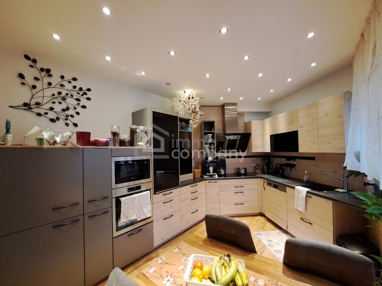 Die offene Wohnküche ist der perfekte Ort für gemeinsame Mahlzeiten und gesellige Abende mit Familie und Freunden. Die hochwertige Einbauküche bietet viel Stauraum und ist mit modernen Elektrogeräten ausgestattet. Von hier aus haben Sie auch direkten Zugang zu einem der vielen Außenbereiche des Hauses.