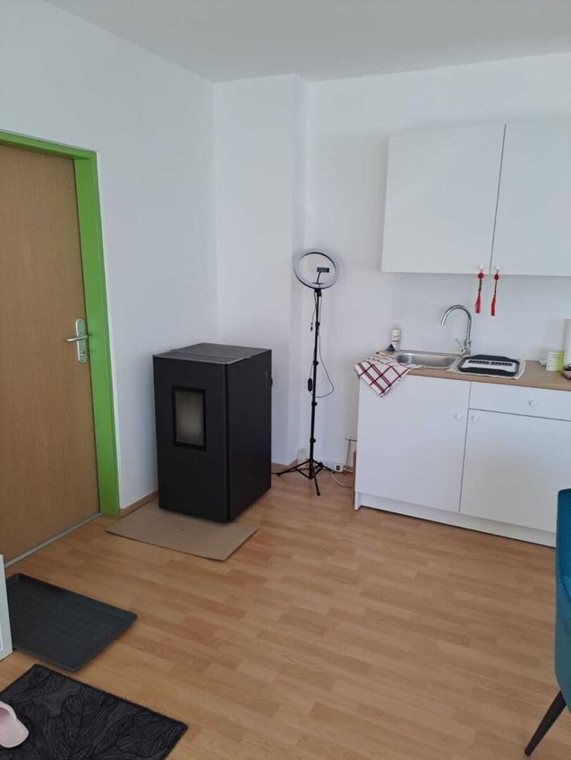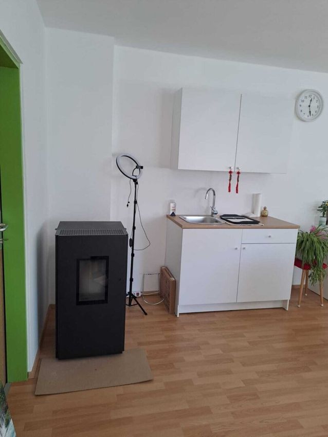 Neue Fenster und neuer Laminatboden, Heizung mit Pelletsofen und elektrisch möglich, Miniküche, WC. Fotos mit Einrichtungsbeispiel.