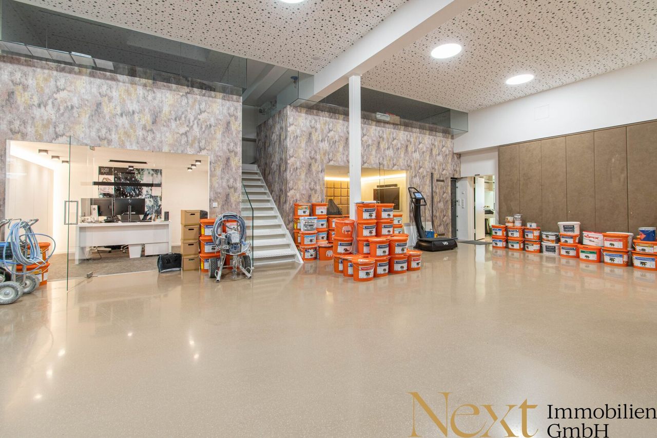 Im Erdgeschoss des Gebäudes gelangt man zunächst in den offenen Empfangsbereich. Von dort aus sind die Büroräumlichkeiten, separate Toiletten und eine Teeküche begehbar. Im hinteren Teil des Objekts befinden sich die unterschiedlichen Lagerräumlichkeiten, weitere moderne Büros, sowie ein...