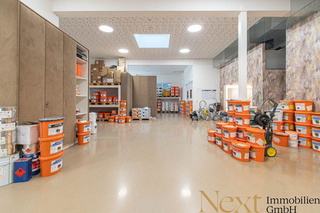 Im Erdgeschoss des Gebäudes gelangt man zunächst in den offenen Empfangsbereich. Von dort aus sind die Büroräumlichkeiten, separate Toiletten und eine Teeküche begehbar. Im hinteren Teil des Objekts befinden sich die unterschiedlichen Lagerräumlichkeiten, weitere moderne Büros, sowie ein Besprechungsraum.