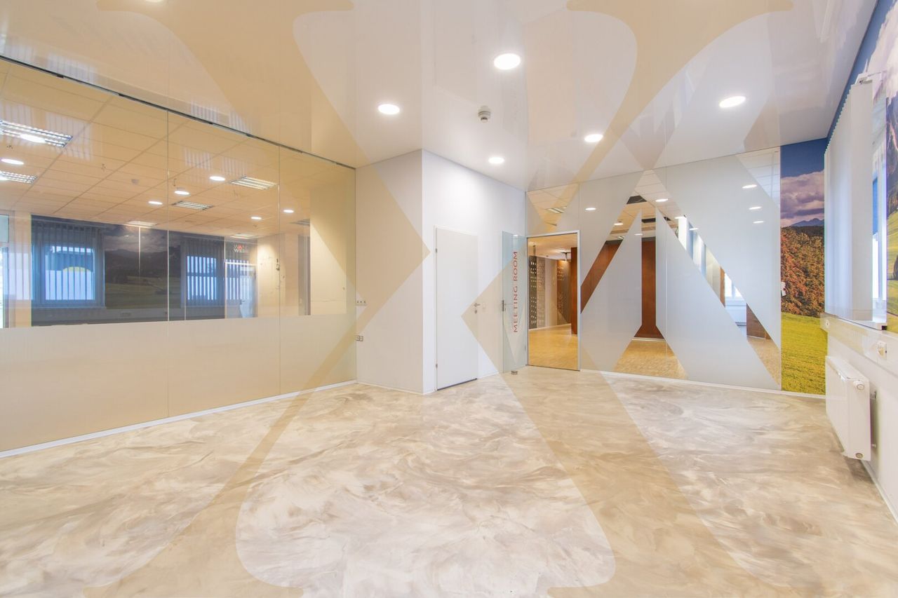 Die Einheit verfügt über sechs separate Büroräume, einen Besprechungsraum sowie einen großzügigen Empfangsbereich, der fließend in eine weitere große, flexibel nutzbare Fläche übergeht – ideal als Großraumbüro, Aufenthaltsbereich oder zusätzliche Arbeitszone.