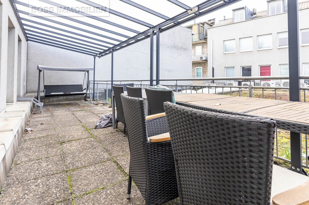 Schon beim Eintreten empfängt Sie ein weitläufiger Empfangsbereich – ideal, um Kundinnen und Kunden stilvoll willkommen zu heißen. Von hier aus gelangen Sie zentral in alle weiteren Räume sowie auf die überdachte Terrasse, die zusätzlichen Freiraum bietet. Raumaufteilung & Ausstattung
