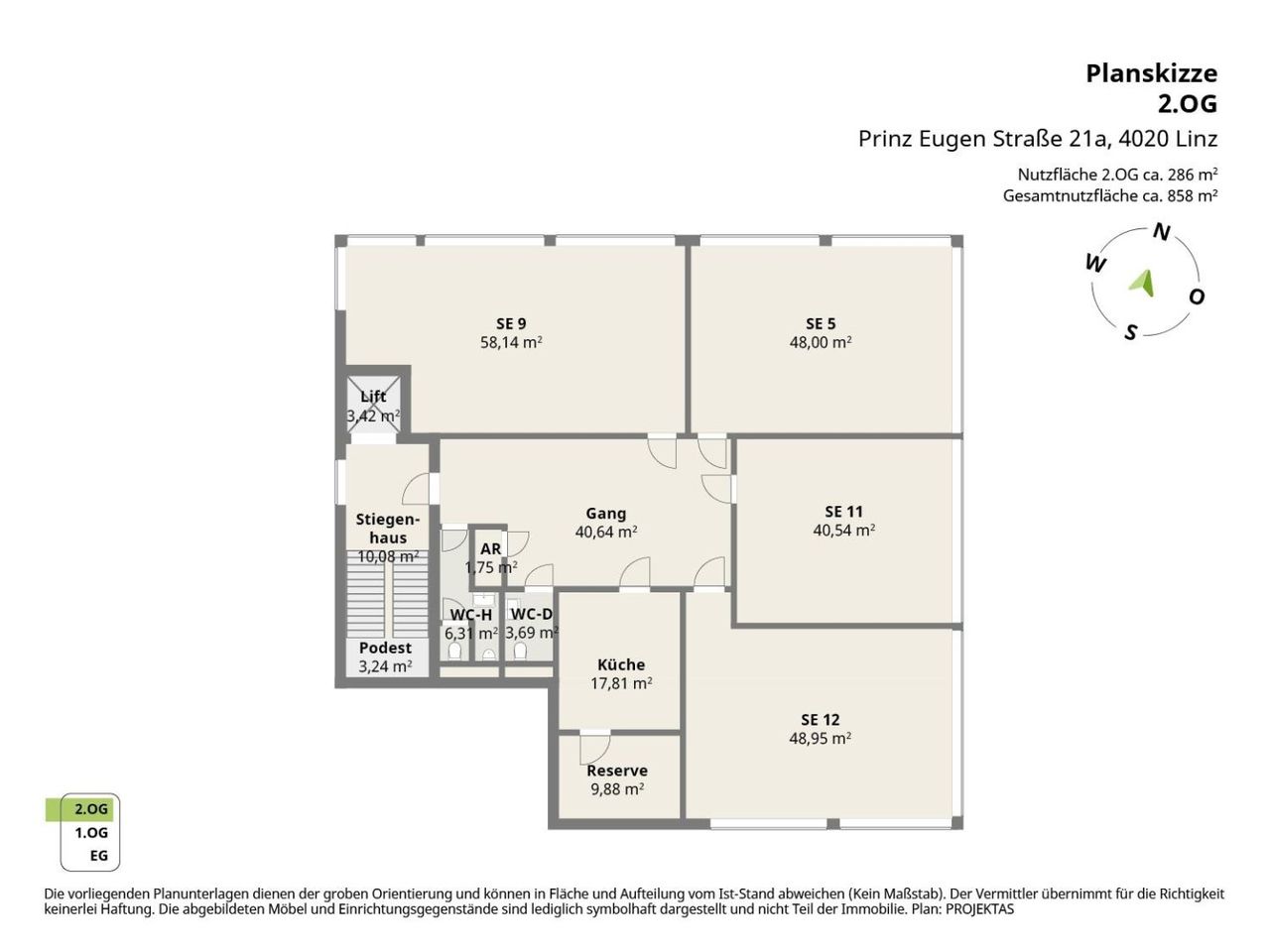 Raumaufteilung: je Stockwerk 4 Großraumbüros, Empfangsbereich, getrennte Sanitärräume