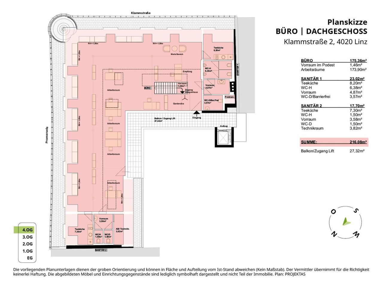 NEUBAU - DACHGESCHOSS - KLIMA - LIFT QUICKFACTS Nutzfläche gesamt: ca. 243,40 m² Bürofläche: ca. 175 m² Sanitärflächen ca. 40 m² Balkonfläche: ca. 27 m² Raumaufteilung: in Abstimmung mit Mieter Stockwerk: 3. OG mit Lift Nettomiete / m²: ab € 25,00 je nach Ausbaustufe Bezugstermin: Q2 / 2026 OBJEKTBESCHREIBUNG Im Zuge der aktuellen Sanierung dieses historischen Bestandsgebäudes entsteht ein neues, exklusives Büro im Dachgeschoss mit herrlichem Ausblick über die Promenade und das Landhaus. Auf ca. 216 m² Nutzfläche können Ihre Büroräumlichkeiten nach Wunsch konfiguriert werden. Das klimatisierte Büro ist selbstverständlich mit Lift erreichbar und bietet einem modernen Unternehmen einen idealen...