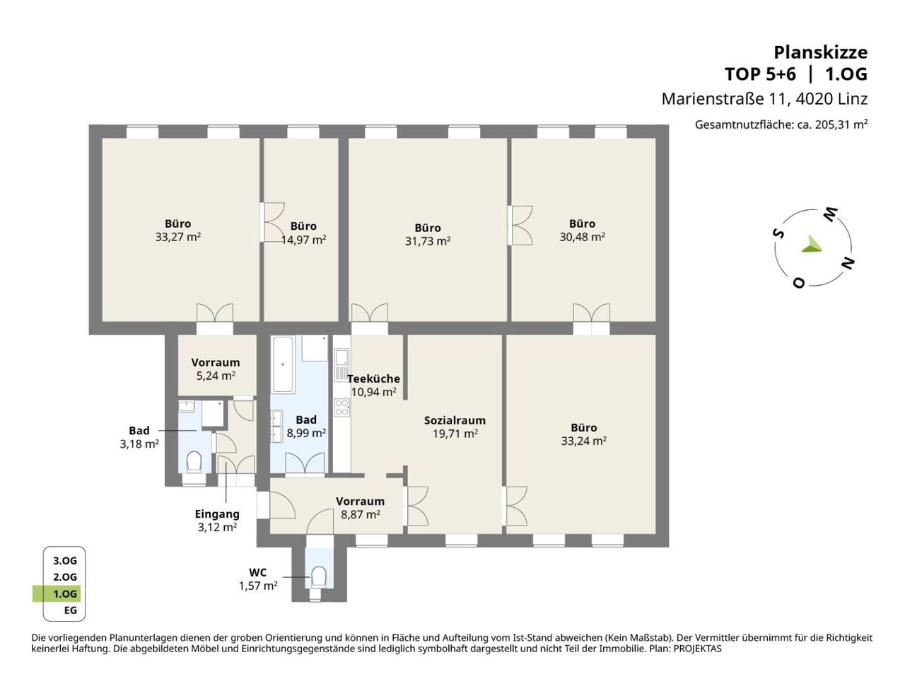 Besonders hervorzuheben sind die 4 großen Räume (je ca. 30 m²) welche sich ideal für große Besprechungsräume und Mehrpersonenbüros eignen. Zwei getrennte WC''s und Bad mit Dusche gehören ebenfalls zur Ausstattung.
