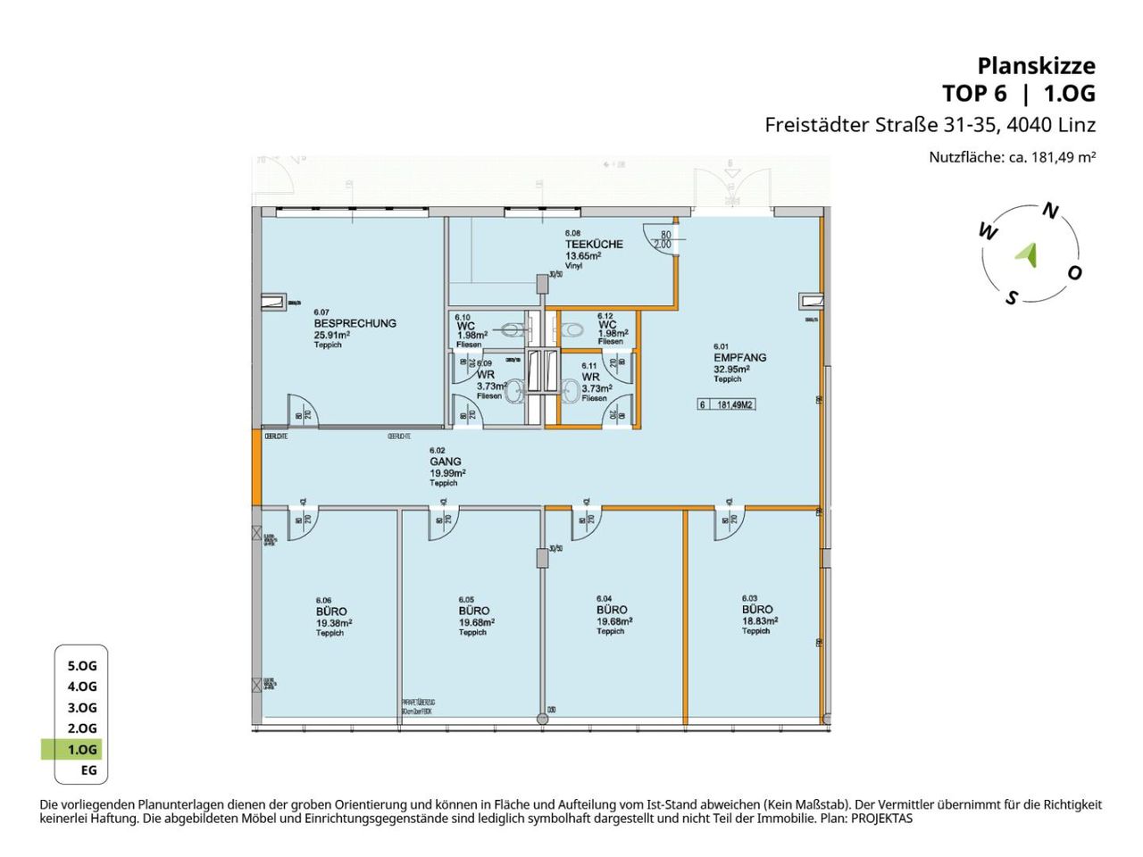 Raumaufteilung: Empfang, 4 Büroräume zur Einzel-/Doppelnutzung, Besprechung, getrennte Sanitäranlagen, Teeküche