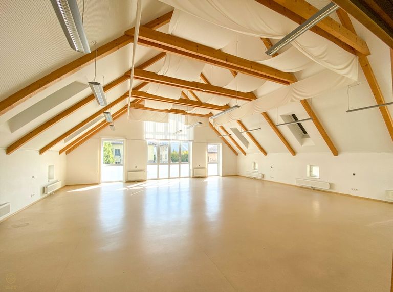Der große Saal des Geschäftslokals überzeugt vor allem mit der beeindruckenden höhe, sowie die modern gestalteten Dachbalken.