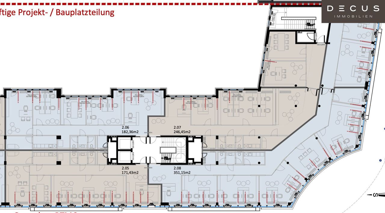 Ein Regelgeschoß ist zwischen 1.640m² und 1.850m² groß und kann in bis zu acht getrennte Mietflächen unterteilt werden. Großzügige Terrassen stehen im 1., im 3. und natürlich im beliebten Dachgeschoß zur Verfügung.