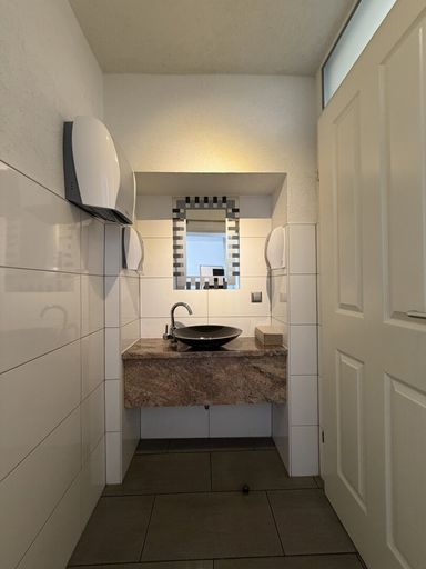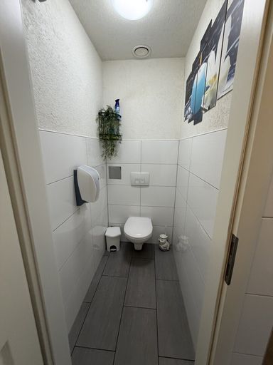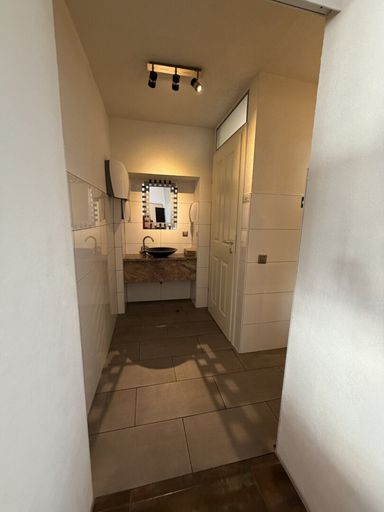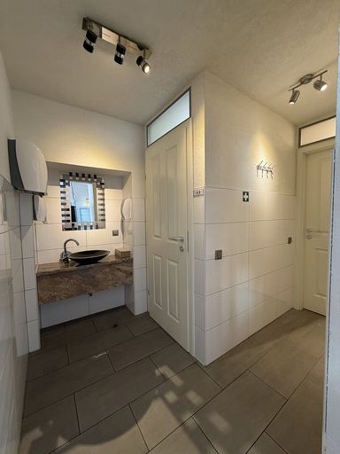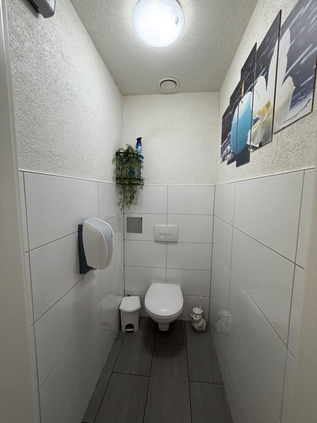 Sanitärbereich mit Dusche: Komfortabel ausgestattet, ideal für Personal und Kundschaft.