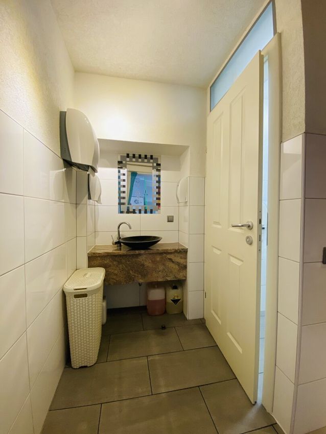 Sanitärbereich mit Dusche: Komfortabel ausgestattet, ideal für Personal und Kundschaft.