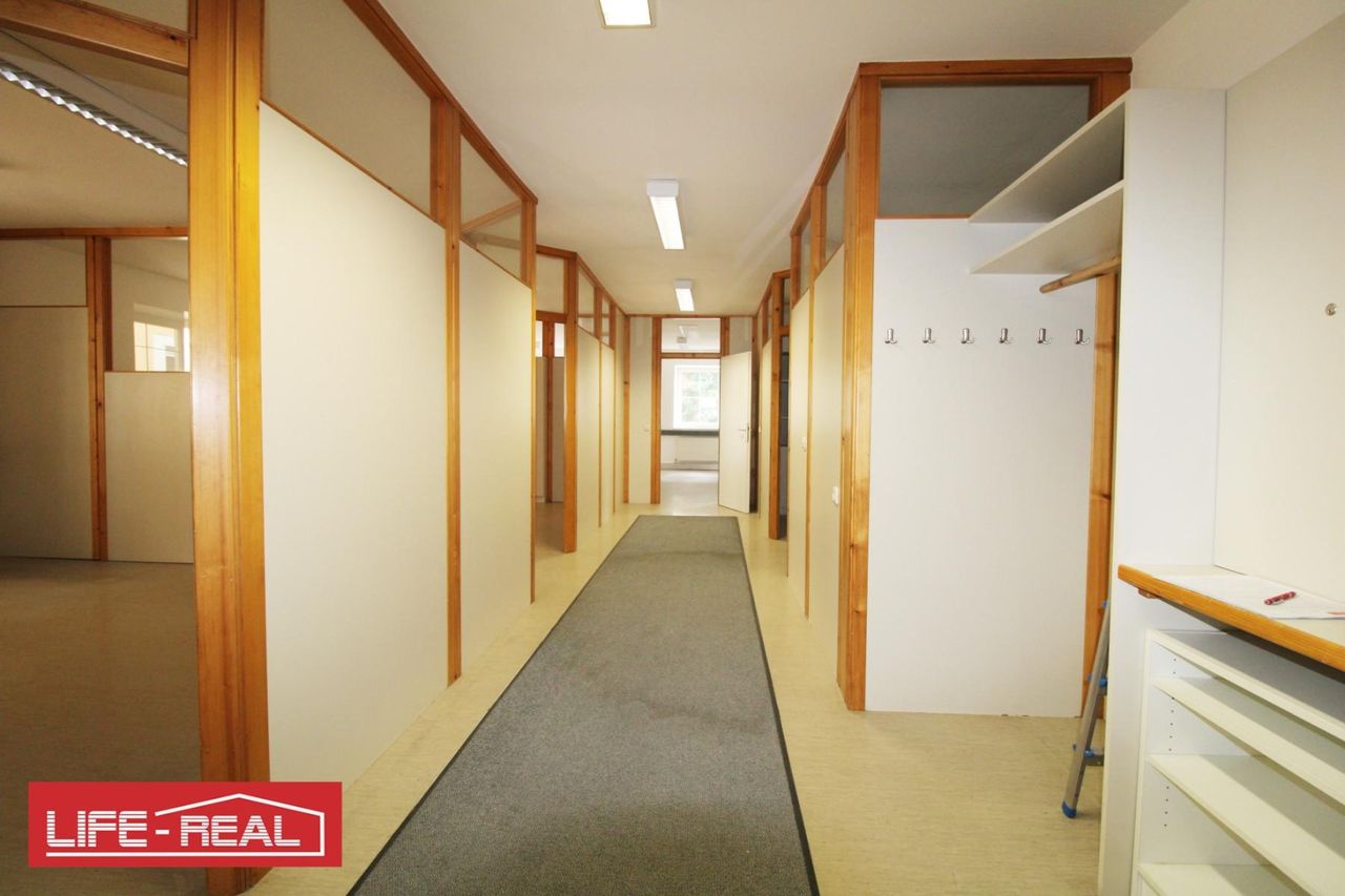 Das Büro erstreckt sich über insgesamt sieben gut aufgeteilte Räume und wird durch einen großzügigen Flur verbunden, der sich ideal als Empfangs- oder Wartebereich eignet. Der Eingangsbereich verfügt über zwei separate Toiletten, die bei Bedarf vom Eigentümer saniert werden können. Ein zusätzlicher Küchenraum mit Einbauküche steht ebenfalls zur Verfügung und kann ohne Ablöse genutzt werden.