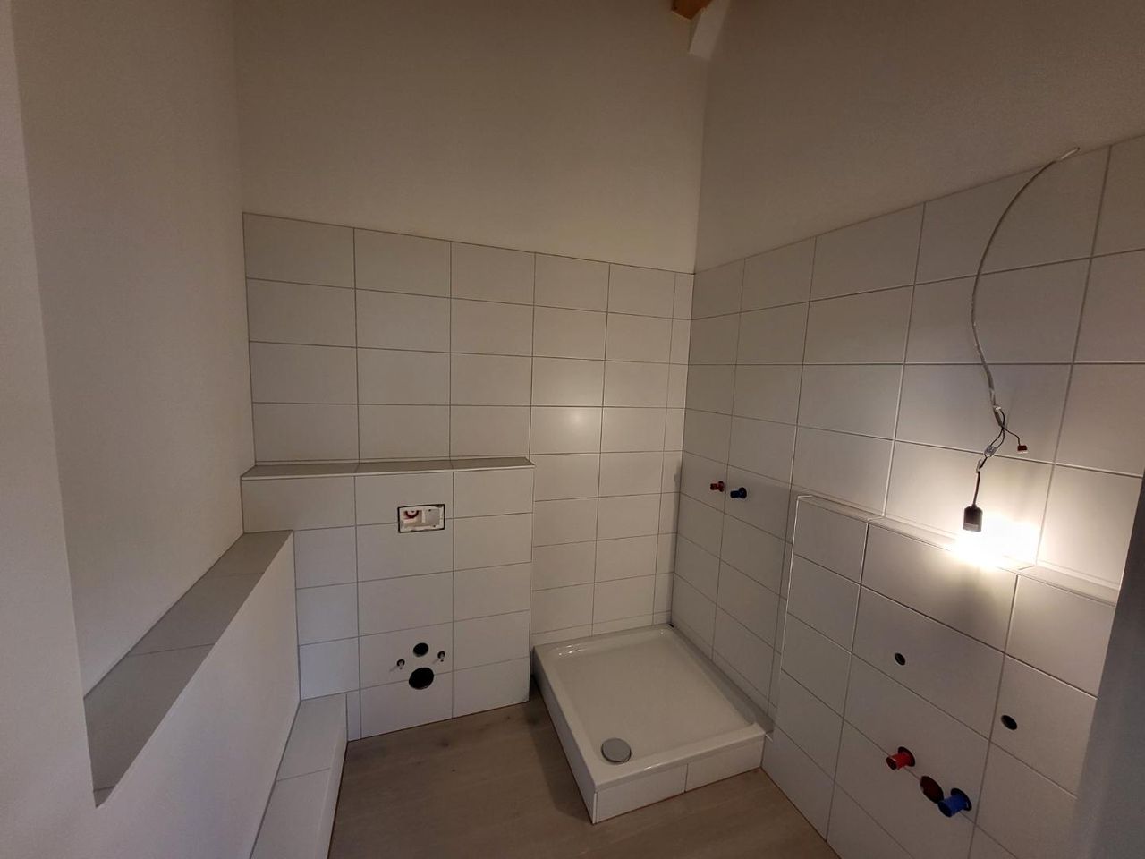 Verlegt wurde Laminatboden, das Bad mit Dusche und das WC sind verfliest.