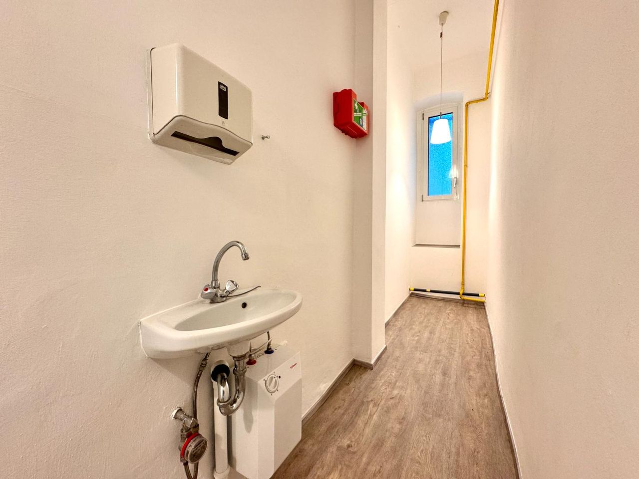 Hinter dem Hauptverkaufsraum befindet sich ein Abstell- und Lagerraum, welcher durch ein hofseitiges Fenster natürlich belichtet wird. Er verfügt ein Waschbecken mit Untertischspeicher, das Ihnen die Möglichkeit für den Einbau einer kleinen Teeküche bietet.