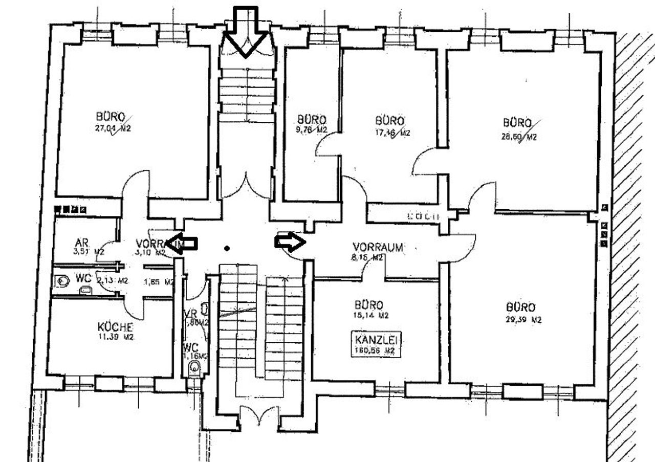 Zur Vermietung gelangt diese rund 160m² große Bürofläche in zentraler, sehr guter Lage von Klosterneuburg. Sie verfügt über 6 Zimmer und eine Küche, 2 separate Toiletten sowie über einen Abstellraum. Die Fläche umfasst das gesamte Erdgeschoß (Parterre) eines sehr gepflegten, 2 geschoßigen Altbaus. Über eine Treppe gelangt man in das Stiegenhaus, wo sich die 2 Eingänge zu den getrennten Einheiten befinden. Einerseits bilden 5 Räume einen Einheit und auf der anderen Seite bilden ein Büroraum, eine Küche, ein Abstellraum sowie eine separate Toilette eine Einheit. Die ehemaligen Kanzleiräumlichkeiten befinden sich in einem gebrauchten Zustand.