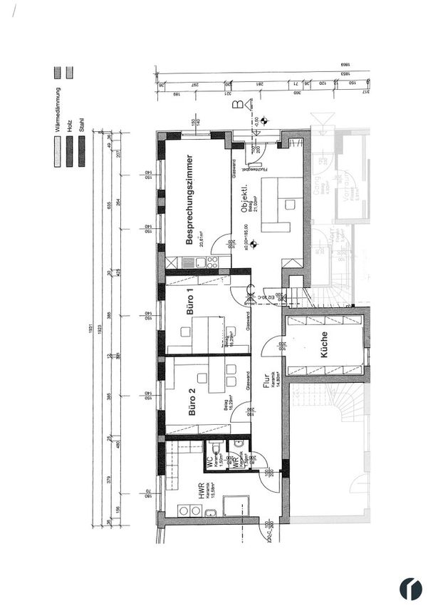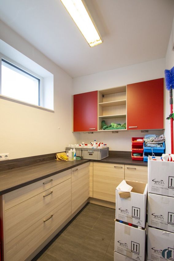 Insgesamt stehen 3 separate Büros bzw. Behandlungsräume zur Verfügung. Im Eingangsbereich wurde ein Büroplatz in Form einer Rezeption installiert. Die weiteren Räumlichkeiten umfassen in ihrer derzeitigen Nutzung einen Besprechungsraum mit großem Tisch samt Beamer, 2 Büros mit je 1-2 Arbeitsplätzen, eine komplett ausgestattete Teeküche, einen Wirtschaftsraum sowie ein WC samt Vorraum mit Waschbecken.