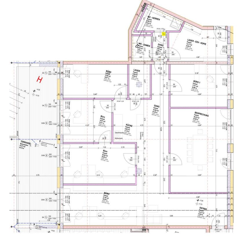 Das Mietobjekt verfügt über 5 Büros, einen Besprechungsraum, ein Damen WC und ein Herren WC, Küche, Lager, EDV-Lager, Gang und eine Terrasse im Ausmaß von ca. 48 m².
