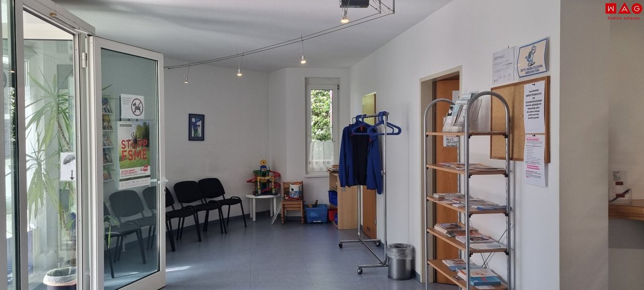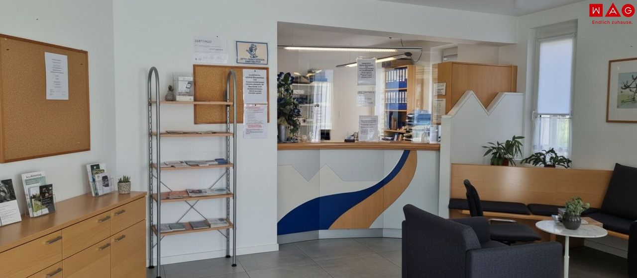 - Großzügiger Warteraum mit fest eingebautem Empfangstresen, ergänzt durch einen Plexiglasschutz für Hygiene und Sicherheit