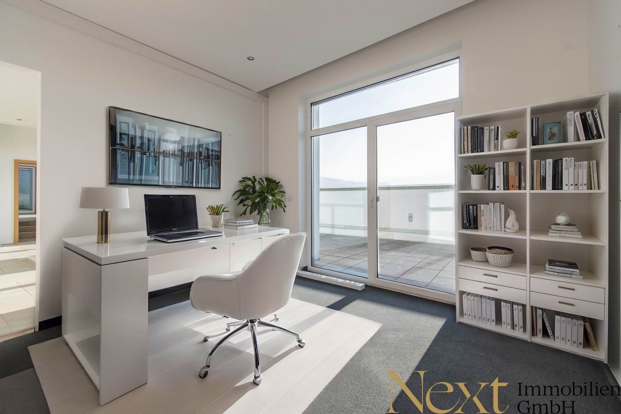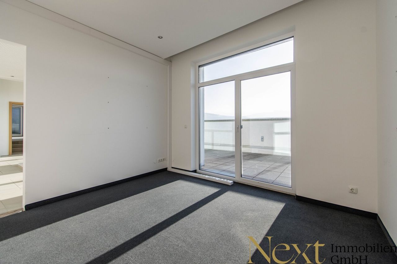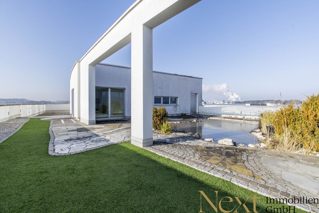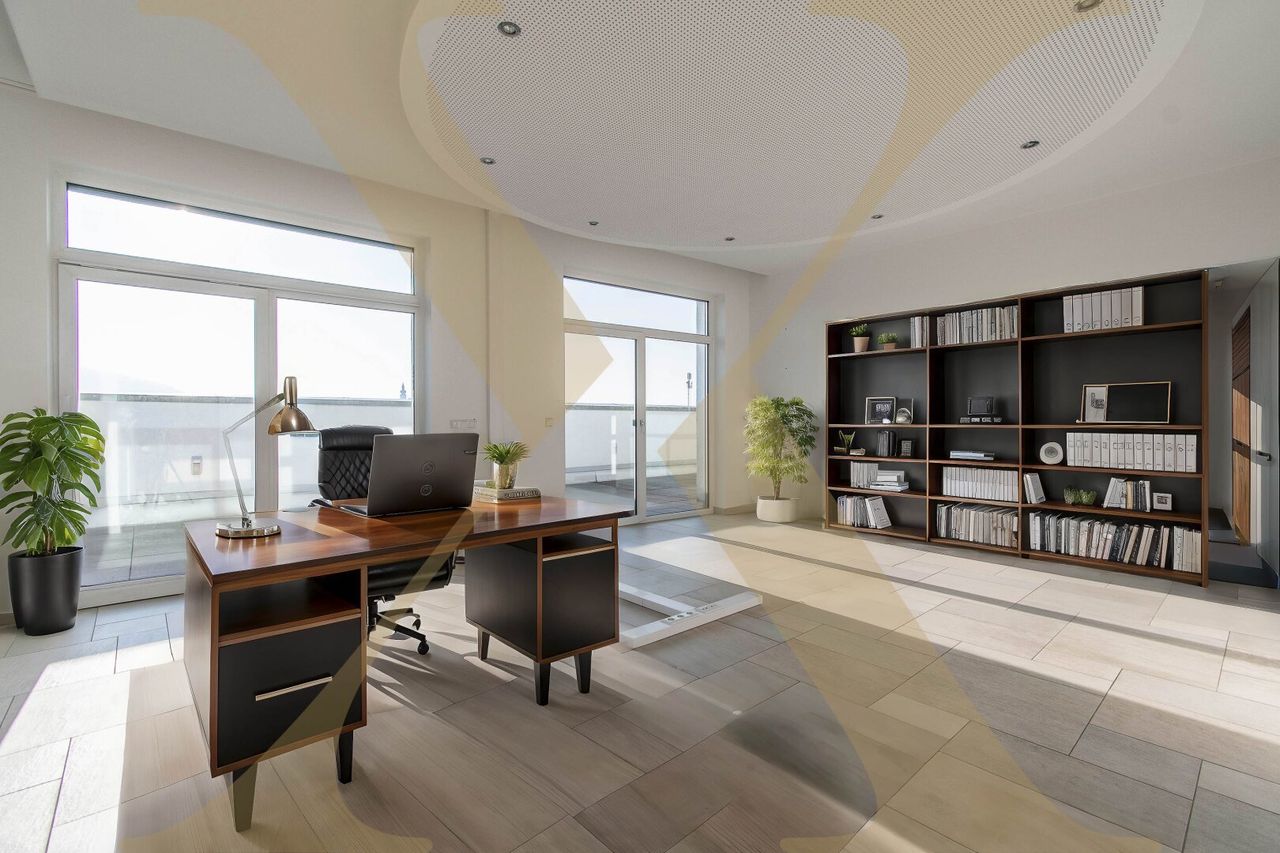Das Penthouse-Büro im Dachgeschoss verfügt über ca. 188,23m² und befindet sich in gepflegtem Zustand. Die Fläche ist auf mehrere Büroräume, eine möblierte Küche, einen Sozialraum, Sanitärräume, Garderoben sowie Archiv- und Lagerflächen aufgeteilt. Ein Highlight ist die großzügige Dachterrasse mit ca. 253,64m², einem kleinen Teich und einem fantastischen Ausblick ins Umland. Zusätzlich sorgt eine private Wellnessoase mit Sauna und Badewanne für außergewöhnlichen Komfort.