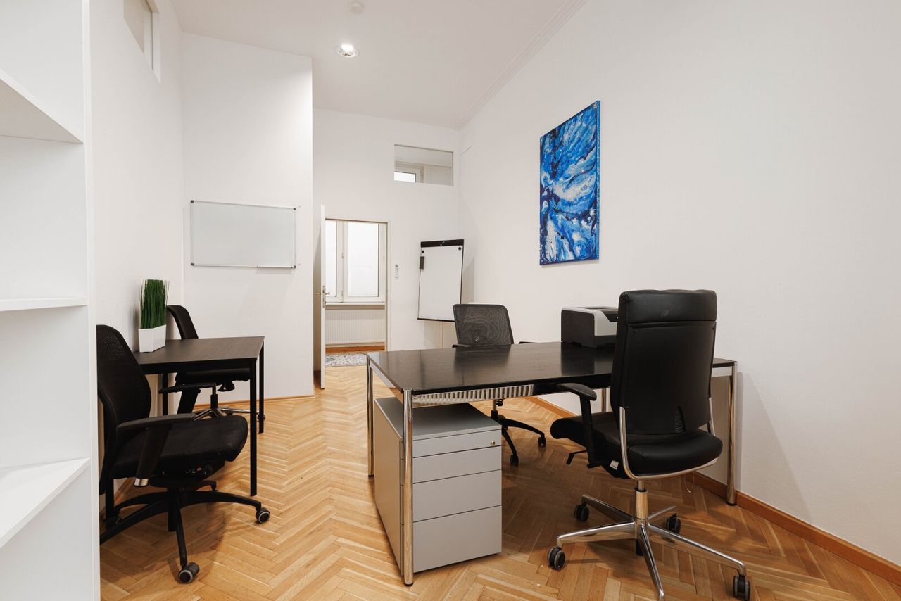 Das Büro bietet ausreichend Platz für einen vollwertigen Arbeitsplatz sowie einen kleinen Tisch für Beratungs- oder Klientengespräche. Die moderne, gepflegte Umgebung trägt zu einem professionellen Auftreten gegenüber Kund*innen bei.