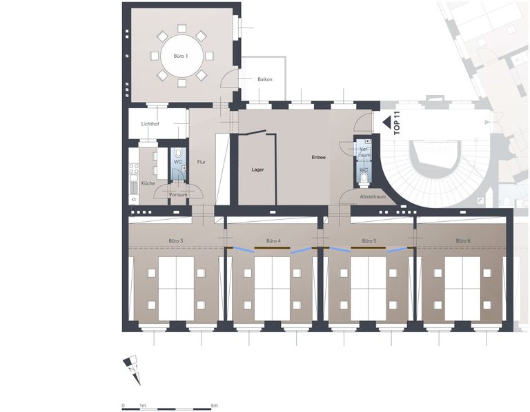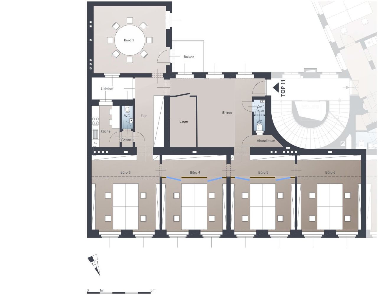 Aufteilung: - geräumiges Entree/Vorraum - 5 getrennt begehbare Büroräume - Küche - getrennte Toiletten - Abstellraum/Lager - Balkon