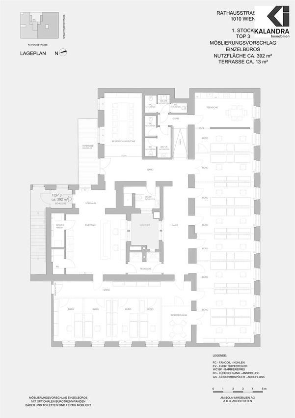 Die gegenständliche Bürofläche erstreckt sich über eine Gesamtfläche von ca392 m²und besticht durch eine durchdachte sowie funktionale Grundrissgestaltung: