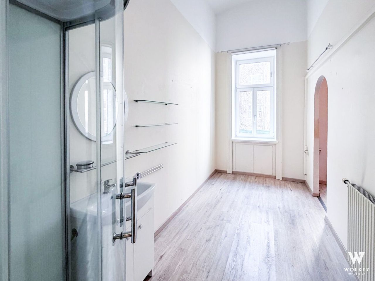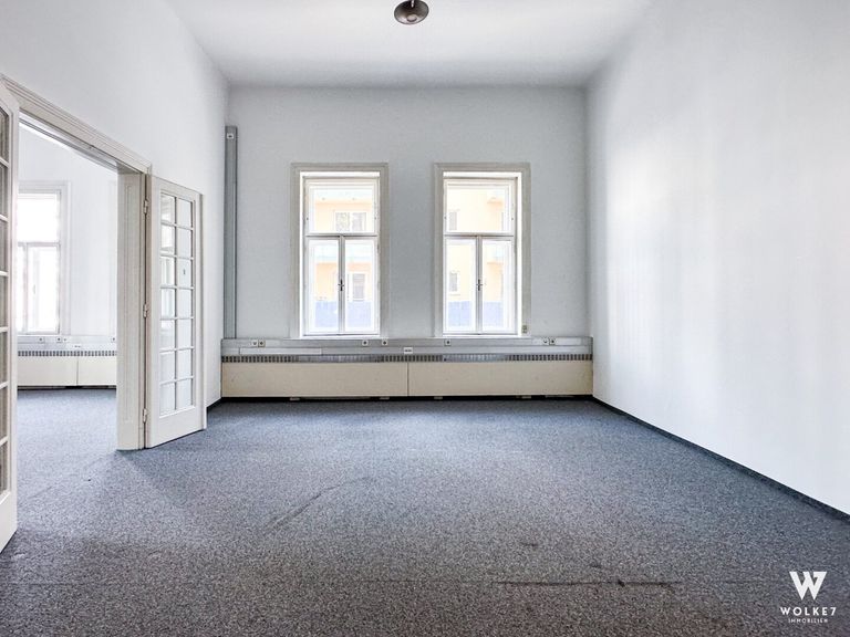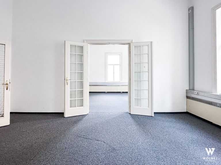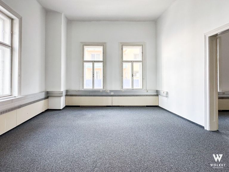 Über den Vorraum und den zentralen Gang erreichen Sie fünf helle, großzügige Arbeitsräume, die sich ideal in zwei Bereiche unterteilen lassen: drei miteinander verbundene Zimmer sowie zwei weitere zusammenhängende Räume. Der Vorraum kann etwa als Empfangsmöglichkeit oder Warteraum genutzt werden Die fünf Hauptbüros eignen sich ideal als Einzel- oder Teambüros. Alternativ können sie auch als Besprechungsräume dienen. Ein zusätzlicher, etwas kleinerer Raum bietet sich perfekt als Serverraum, Archiv, oder separater Arbeitsbereich, etwa zum ungestörten Telefonieren, an. Darüber hinaus verfügt diese Bürofläche über ein Bad mit Dusche, eine separate moderne Einbauküche mit angrenzendem Innenhofbalkon sowie 2 getrennte WCs.