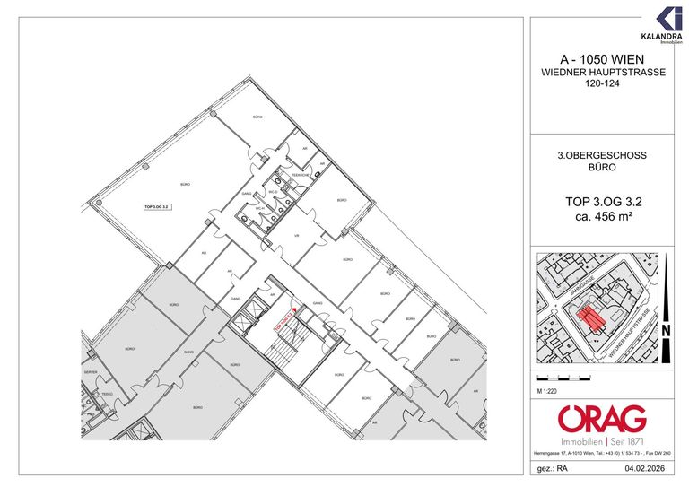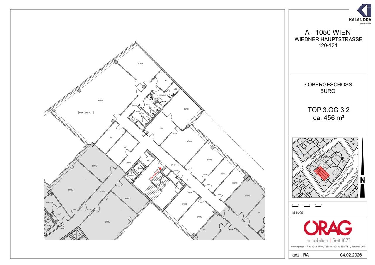 NEUBAU-BÜROFLÄCHE Diese im 5. Liftgeschoß eines modernen Neubaus gelegene Bürofläche gliedert sich wie folgt: Raumaufteilung: 11 Büroräume, 4 Abstellräume, Teeküche, 2 WC Einheiten mit je 2 WC und dazugehörigen Waschräumen Ausstattung: - Teppichbelag, - EDV-Kabelauslässe, Das Entree des Hauses ist sehr repräsentativ, der Empfang wird von einem Sicherheitsdienst betreut. Für die monatlichen Klimatisierungskosten werden dzt. Euro 0,58/ m² netto vorgeschrieben. Infrastruktur: PKW-Stellplätze gibt es in einer hauseigenen Garage a € 120,- + 20% USt. Die Infrastruktur kann als sehr gut bezeichnet werden: Geschäfte des täglichen Bedarfs und nette Lokale finden Sie in der Wiener Haupstraße; öffentliche Verkehrsmittel: Straßenbahnlinien 1, 62,...