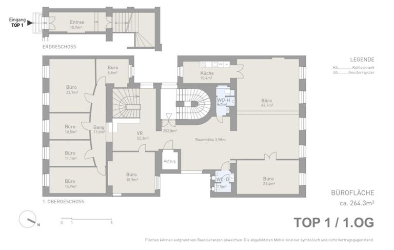 Über einen beeindruckenden Treppenaufgang - oder einen Lift en-suite - erreichen Sie das Büro, das Ihnen auf ca. 265 m² ein Großraumbüro sowie sieben weitere getrennt begehbare Büros bietet. Besonders ist der loftartige, moderne Charakter, kombiniert mit altbautypischen Elementen wie Parkettböden und beeindruckenden Raumhöhen.