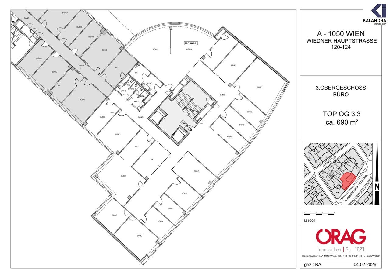 NEUBAU-BÜROFLÄCHE Diese im dritten Liftgeschoß eines modernen Neubaus gelegene Bürofläche gliedert sich wie folgt: Raumaufteilung: 18 Büroräume, 4 Abstellräume, Teeküche, 2 WC Einheiten mit je 2 WC und dazugehörigen Waschräumen Ausstattung: - neuer Teppichbelag, - EDV-Verkabelung, - Malerein neu. Das Entree des Hauses ist sehr repräsentativ, der Empfang wird von einem Sicherheitsdienst betreut. Für die Beheizung & Klimatisierung werden dzt. monatlich Euro 0,57/ m² netto vorgeschrieben. Infrastruktur: PKW-Stellplätze gibt es in einer öffentlichen Garage in der Nähe. Die Infrastruktur kann als sehr gut bezeichnet werden: Geschäfte des täglichen Bedarfs und nette Lokale finden Sie in der Wiedner Haupstraße; öffentliche Verkehrsmittel:...