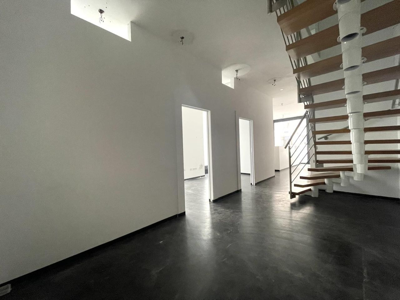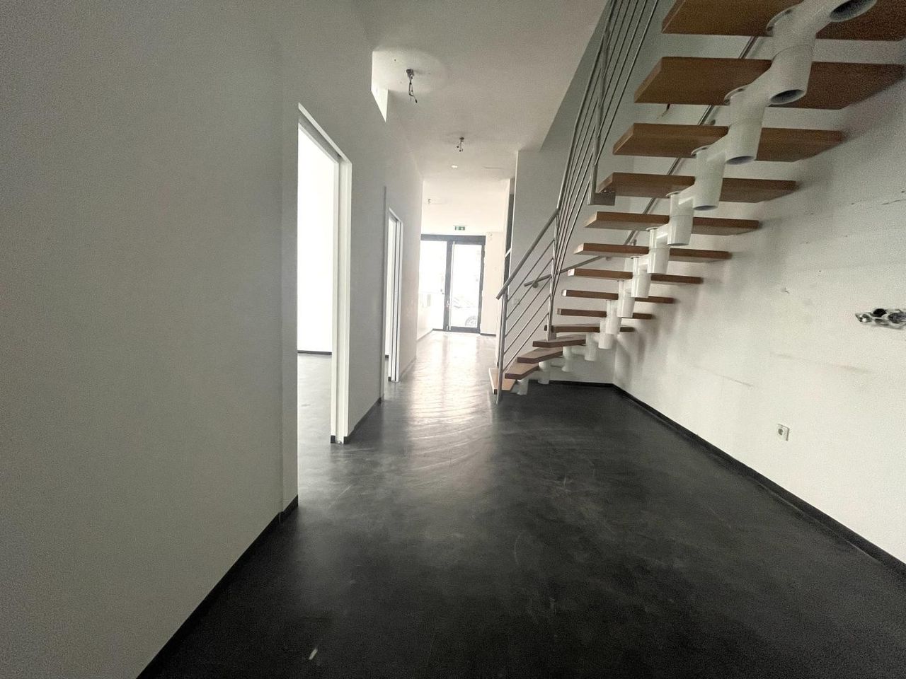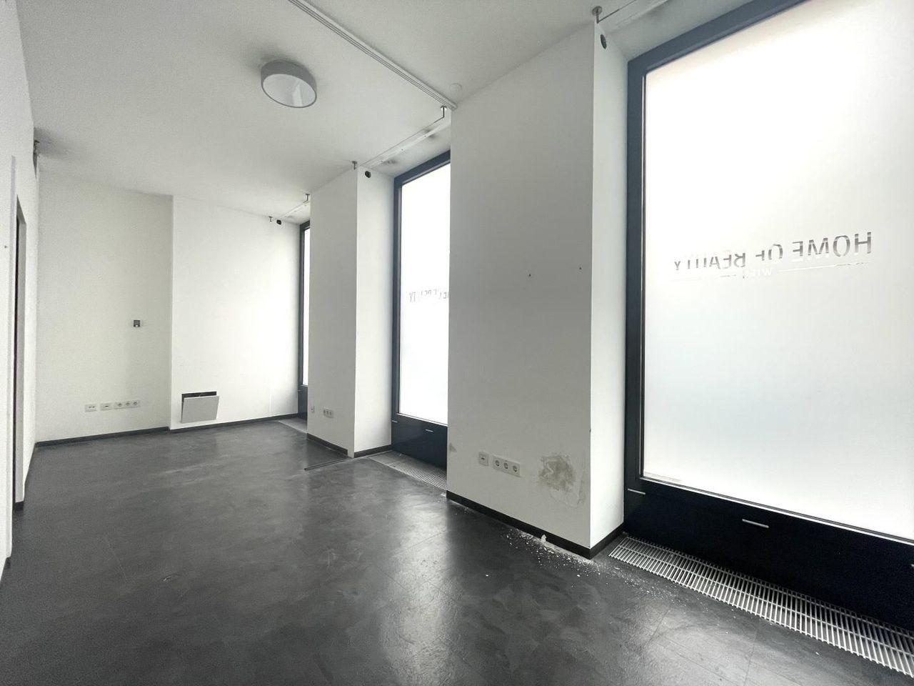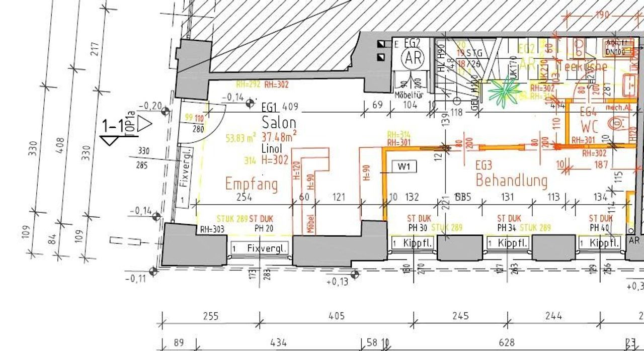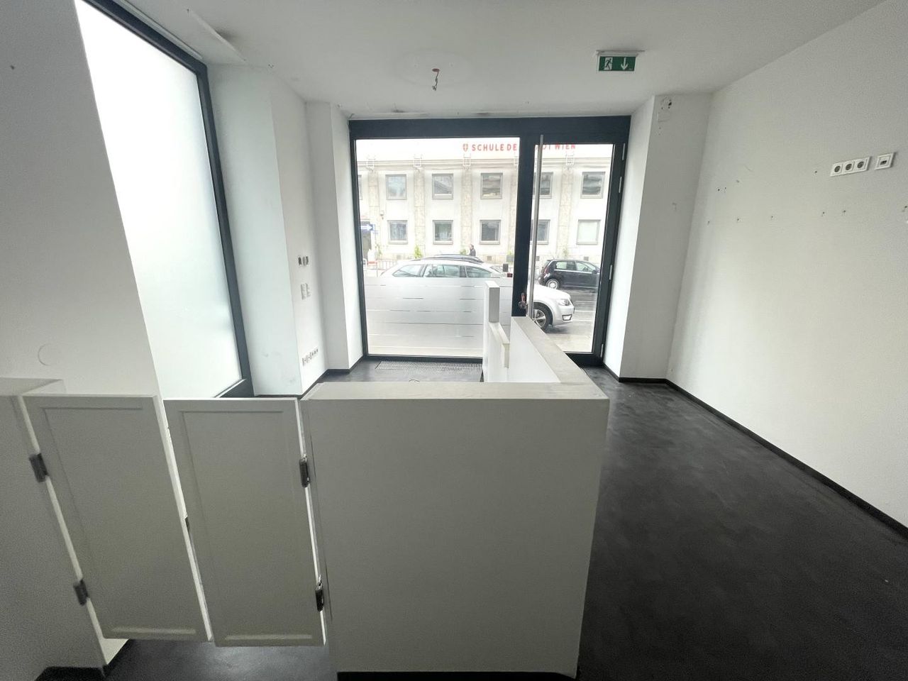 Die Bürofläche teilt sich auf eine Erdgeschoßfläche (57,17m²) mit direktem Straßenzugang von der Burggasse und eine weitere Fläche im 1. OG (52,41m²), die über eine innenliegende Treppe und auch direkt über das Stiegenhaus (1. Liftstock) erreichbar ist, auf.