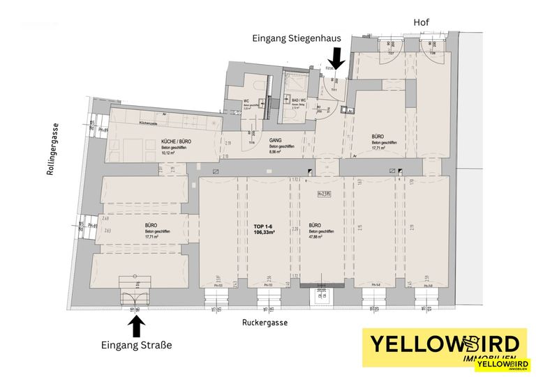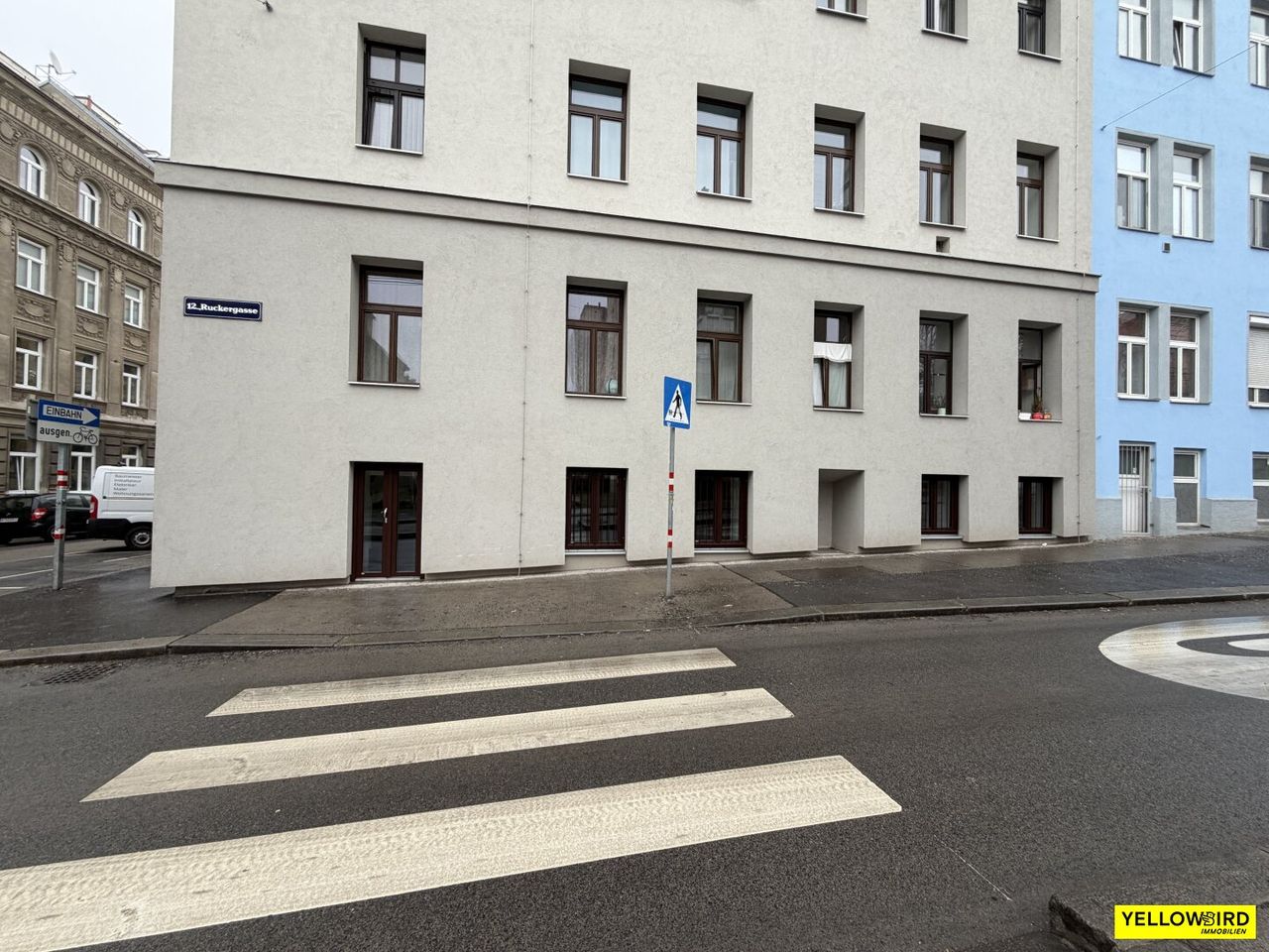 Das Büro liegt im 1. Kellergeschoss und ist sowohl direkt von der Straße als auch über das Stiegenhaus bequem begehbar. Der Innenhof steht zusätzlich als ruhiger Rückzugs- oder Aufenthaltsbereich zur Verfügung. Die Räumlichkeiten eignen sich ideal für Agenturen oder kreative Unternehmen, die eine zentrale und zugleich ruhige Arbeitsumgebung suchen.
