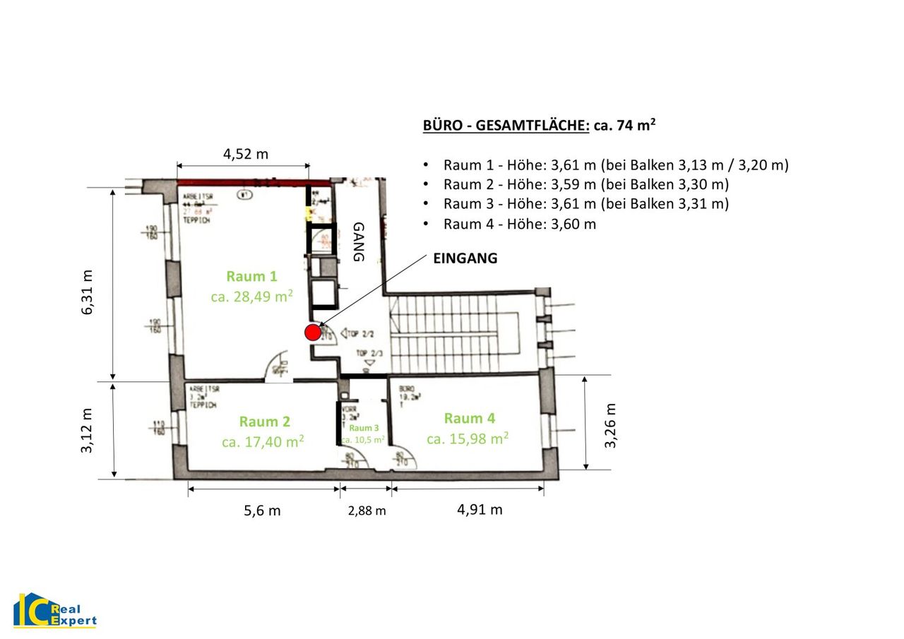 Das Büro liegt im 2. OG eines sehr gepflegten Wohn-und Geschäftshauses, BJ 1930, kein Lift vorhanden.