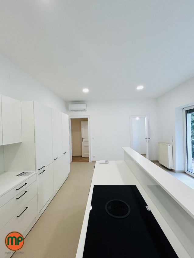 Die voll ausgestattete Küche mit hochwertigen Geräten fügt sich harmonisch in das elegante Gesamtbild ein und kann für Pausen genutzt werden. Ein besonderes Highlight ist der charmante Balkon, der an die Küche angrenzt – ein ruhiger Rückzugsort, der für kleine Pausen zusätzlichen Komfort bietet.