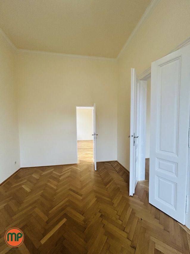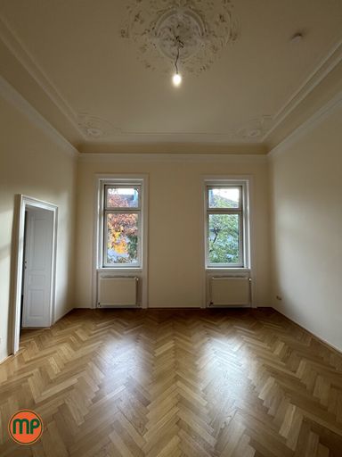 Im 1. Stock, ohne Lift, empfängt Sie ein großzügiger Eingangsbereich, der als zentraler Verteiler zu vier der insgesamt sechs Räume dient. Die Räumlichkeiten zeichnen sich durch beeindruckende Raumhöhen, kunstvollen Stuck, historische Flügeltüren und hochwertigen Parkettboden aus – Merkmale, die dem Büro seine unverwechselbare Altbau-Atmosphäre verleihen.