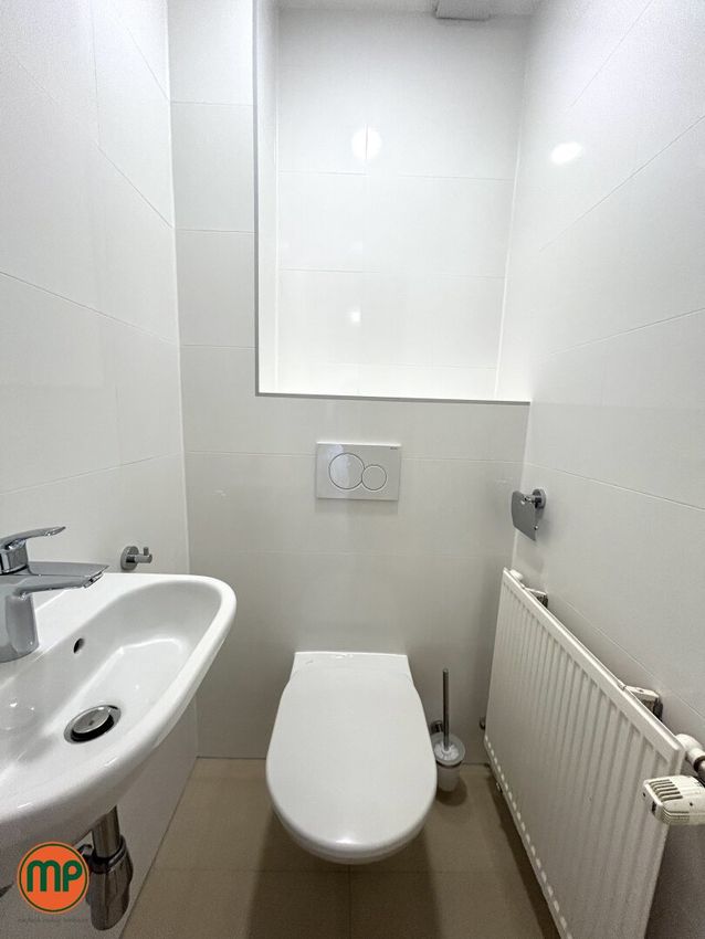 Das stilvoll ausgestattete Badezimmer verfügt über Badewanne, Dusche und WC; ein separates Gästebad mit Handwaschbecken ist entlang des Eingangsbereichs vorhanden – ideal für Mitarbeiter und Besucher. Zwei Abstellräume bieten ausreichend Platz für Akten, Büromaterial oder IT-Ausstattung.